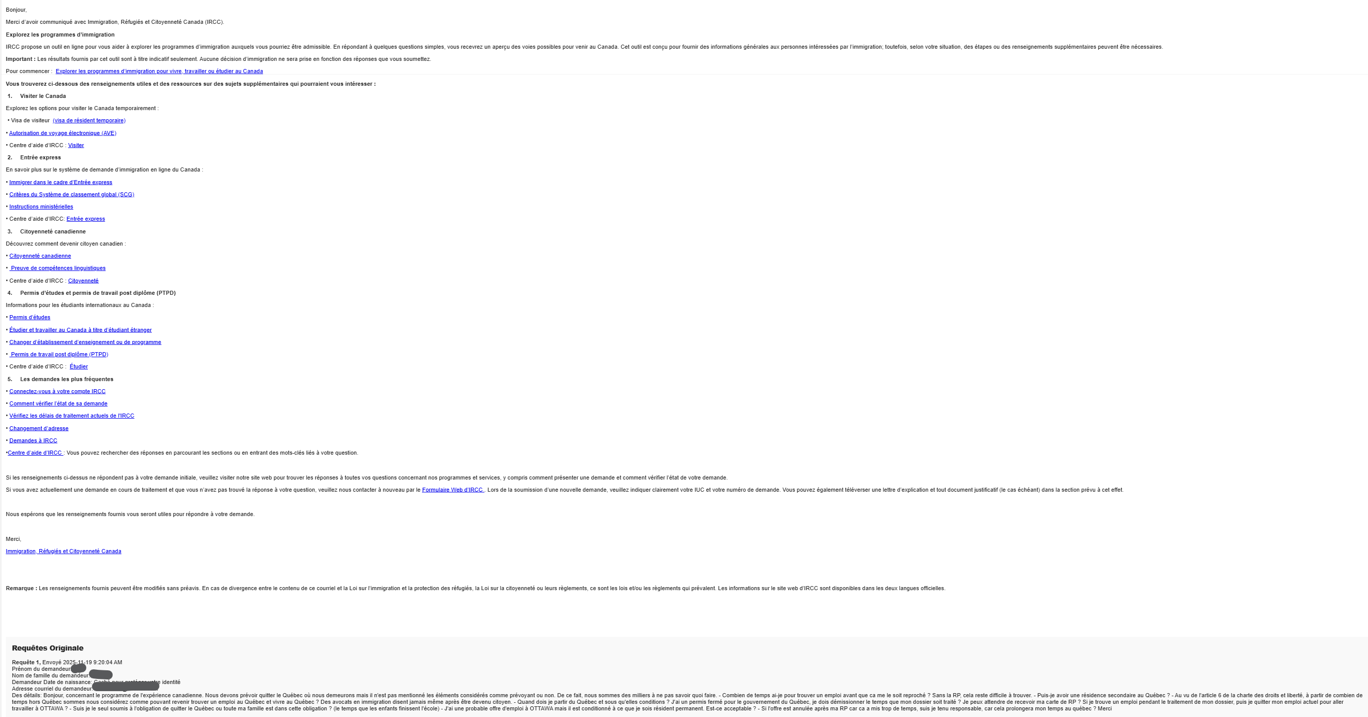 Bonjour à tous, j'ouvre le débat et surtout la demande d'information issue de jurisprudences, texte de loi ou de vrais retours d'expérience. Pas des suppositions. On est beaucoup avec la fin du PEQ de se rabattre sur EE expérience canadienne. Bien évidemment, il faut "devoir prévoir demeurer hors la province de Québec". En tant qu'ancien dans le droits, c'est très très peu précis et sujet à discussions. Mais quoi qu'on en dise, c'est IRCC qui a le dernier mot. Mais après recherche, je ne trouve pas ce dernier mot. C'est pas clair du tout. Si on se fît juste au texte. Notre dossier EE doit comporter des éléments de preuve devant démontrer que nous prévoyons habiter hors la province de Québec. En droit, les mots et leur placement sont étudiés. "Vous devez prévoir habiter hors la province de québec". Vous : Qui est vous ? le demandeur principal ? la famille du demandeur ? Devez : C'est un devoir, quelque chose que nous devons obligatoirement faire. Donc on doit obligatoirement faire ce qui est prévu au prochain mot. Prévoir : Voir à l'avance. Préparer. Organiser à l'avance. habiter : Vivre dans un endroit de facon habituel. hors la province de québec : notre habitation habituelle ne doit pas être prévue dans le territoire administratif de Québec. Si je suis stricto sensus la phrase, l'obligation se situe dans la prévoyance de trouver une habitation pour un usage habituel à l'extérieur des limites territoriales de Québec. A partir de quand, cette obligation de prévoyance s'éteint elle ? Pour moi, dès qu'on a sa RP car sinon ca va à l'encontre de l'article 6 de la charte des droits et liberté ( https://laws-lois.justice.gc.ca/fra/const/page-12.html#h-42). Une phrase sur un site, même du gouvernement, ne fait pas obstacle à une charte à valeur constitutionnelle. D'aucuns disent qu'ils faut partir dès qu'on est tiré au sort, dans les 60 jours. Après vérification, les 60 jours sont le temps pour envoyer les preuves matérielles qui étaient restées déclaratives. C'est comme venir au québec avec un statut visiteur alors qu'on a pas recu son CAQ. D'autres, une fois les documents envoyés et validés. Demander un permis ouvert pour aller travailler en dehors de Québec. Si notre dossier a été accepté tel quel, pourquoi ajouter des documents qui risque de rallonger la demande. Ok si tu trouves un meilleur emploi à Toronto. Mais sinon, je trouve que c'est risqué de faire des changements alors que ton dossier ait accepté tel quel. J'ai écris à IRCC avec plein de question et voici la réponse qui n'en est pas une finalement : Réponse automatique, il y a tout sur notre site... Pour ceux qui se pose la question, j'ai déjà trouvé un employeur à Toronto qui m'accepte si je suis RP. Mais je ne veux pas passer par EE si ca me transforme en résident permanent de seconde zone qui n'aura plus jamais le droit de revenir vivre au Québec et/ou m'oblige à partir précipitamment comme un réfugier. Laissez moi finir l'année scolaire, trouver un bon logement, faire la paperasse.