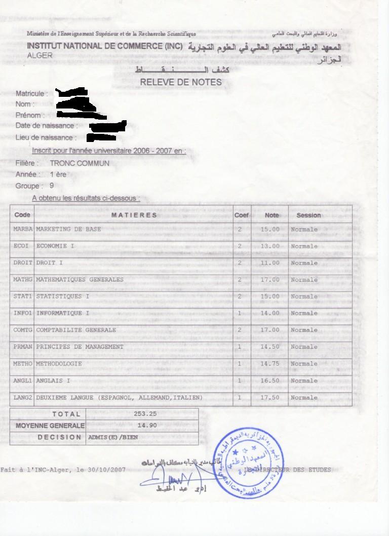 Habitués noor87 Posté(e) 14 juillet 2011 Habitués Posté(e) 14 juillet 2011 Bonjour tout le monde et aux algériens surtout car je crois qu'ils seront plus aptes à me répondre. Certains de mes document sont bilingues (ex. Relevés de notes, diplôme...etc.) c-à-d en français majoritairement avec un cachet en arabe et quelque mots aussi en arabe (Histoire de réécrire ce qui écrit en Français). Je veux savoir s'ils sont valables de cette manière là dans ce cas alors une copie légalisée avec la mention Valable uniquement pour l'étranger peut régler l'affaire ou bien il va falloir traduire l'intégralité de chaque document. Prière de me répondre d'après vos expériences. vous trouverez-ci joint un exemple de mes relevés de notes et dites moi si c'est bien Citer