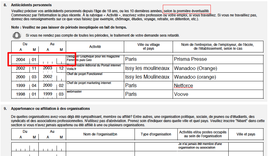 Cyniq Posté(e) 19 août 2011 Posté(e) 19 août 2011 Bonjour à tous, Je suis en train de remplir mon dossier fédéral. Me voilà arrivé au formulaire Annexe A imm5659F > Antécédents personnels. La partie Numéro 8 stipule : "Veuillez préciser vos antécédents personnel depuis l'âge de 18 ans, ou les 10 dernières années, selon la première éventualité." Mais qu'est-ce que cela veut donc bien dire..."Première éventualité". Franchement! J'ai 37 ans, et pour mon CSQ je n'étais remonté qu'à mes 10 dernières années professionnelles. Mais comme ils ne font rien comme tout le monde (photos par exemple), faut-il remonter à 18 ans? Sachant qu'il est préciser en note : "Veuillez ne pas laisser de période de temps sans explication : si vous ne rendez pas compte de toutes les périodes, le traitement de votre demande sera retardé" Ambiance! Je peux remonter jusqu'à 1998 en expérience pro, soit ma 24ème année de vie... Enfin, pour la date en cours, si nous sommes encore en activité... dois-t-on laisser le champs vide? (Suis en CDI). EN pièce jointe la partie en question. Merci pour votre aide... Sébastien Citer