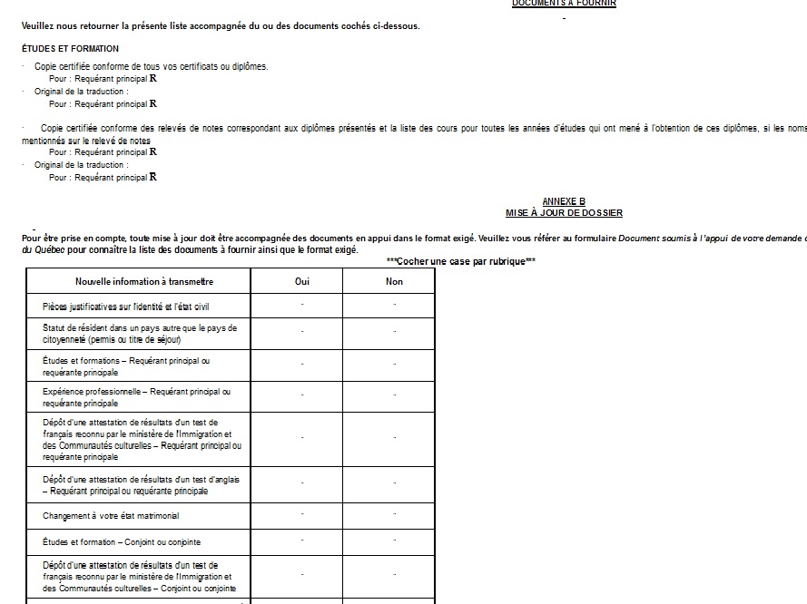Habitués solosolo Posté(e) 13 février 2014 Habitués Posté(e) 13 février 2014 (modifié) CI dessous le courrier que je viens de le recevoir ... j'ai pas bien compris ils veulent quoi exactement svp aidez moi Objet : Documents manquants ou non conformes et mise à jour de votre dossier Monsieur, Nous avons reçu votre demande de certificat de sélection du Québec. Nous avons cependant constaté que certains documents demandés n’ont pas été fournis ou que leur format n’est pas conforme à ce qui est exigé (original, copie certifiée conforme ou photocopie). Pour pouvoir traiter votre demande, nous avons besoin du ou des documents cochés dans la liste ci-jointe. (Voir annexe A) Vous devez également nous transmettre, documents à l’appui, toute nouvelle information (mise à jour) utile à l’analyse de votre dossier. Exemples : nouveau diplôme, ajout d’une personne à charge. (Voir annexe B) Si votre situation familiale change au cours des prochains mois, vous devrez sans tarder nous transmettre le formulaire «Modification à une demande de certificat de sélection» ainsi que tous les documents nécessaires au traitement de cette demande de modification, à l’adresse indiquée à la fin de la présente lettre. Vous trouverez le formulaire à l’adresse suivante : http://www.immigration-quebec.gouv.qc.ca/fr/formulaires/formulaire-titre/dcs-travailleurs/index.html Vous devrez également acquitter les frais relatifs à cette modification. Pour connaître les tarifs en vigueur et le mode de paiement, consultez l’adresse suivante : http://www.immigration-quebec.gouv.qc.ca/frais Vous disposez d’un délai de 90 jours suivant la date d’envoi de la présente lettre pour nous transmettre, dans un seul envoi, par courrier postal, tous les documents manquants demandés (annexe A) ainsi que tous les documents à l’appui de la mise à jour de votre dossier (annexe B). Vous trouverez dans le formulaire Documents soumis à l’appui de la demande de certificat de sélection (http://www.immigration-quebec.gouv.qc.ca/documents-soumis) des précisions sur les exigences que vous devez respecter quant au format et à la traduction de chaque document soumis. Le format « copie certifiée conforme » indique que la copie du document doit obligatoirement être certifiée par une autorité reconnue. Pour connaître les autorités reconnues, vous devez vous référer à la Liste des autorités reconnues pour certifier conforme des documents (http://www.immigration-quebec.gouv.qc.ca/liste-autorites-reconnues). Vous devez vous assurer de soumettre la documentation dans le format exigé, accompagnée de la présente lettre et des annexes A et B, à l’adresse suivante : 285, rue Notre-Dame Ouest, 4e étage, Montréal, Québec H2Y 1T8 À défaut de recevoir dans le délai fixé une réponse de votre part ainsi que tous les documents exigés dans un seul envoi, nous avons l'intention de rejeter votre demande de certificat de sélection comme le prévoit la Loi sur l'immigration au Québec, et ce, sans aucun autre avis. Notre décision sera rendue sur réception de votre envoi, et ce, même si le délai maximal accordé n’est pas expiré. Nous vous remercions de votre collaboration et de l’intérêt que vous manifestez pour le Québec. Veuillez agréer, Monsieur, nos salutations distinguées. économique ANNEXE A DOCUMENTS À FOURNIR Veuillez nous retourner la présente liste accompagnée du ou des documents cochés ci-dessous. Études et formation · Copie certifiée conforme de tous vos certificats ou diplômes. Pour : Requérant principal R · Original de la traduction : Pour : Requérant principal R · Copie certifiée conforme des relevés de notes correspondant aux diplômes présentés et la liste des cours pour toutes les années d'études qui ont mené à l'obtention de ces diplômes, si les noms des cours ne sont pas mentionnés sur le relevé de notes Pour : Requérant principal R · Original de la traduction : Pour : Requérant principal R ANNEXE B MISE À JOUR DE DOSSIER Pour être prise en compte, toute mise à jour doit être accompagnée des documents en appui dans le format exigé. Veuillez vous référer au formulaire Document soumis à l’appui de votre demande de certificat de sélection du Québec pour connaître la liste des documents à fournir ainsi que le format exigé. ***Cocher une case par rubrique*** Nouvelle information à transmettre Oui Non vous trouvez le tableau en PJ Modifié 13 février 2014 par solosolo Citer