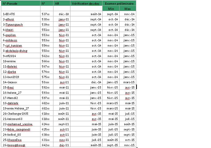Habitués H.Bahrini Posté(e) 29 juillet 2014 Habitués Posté(e) 29 juillet 2014 ======================================TUNISIE======================================== ---------------------------TABLEAU DES ENTREVUES SESSION SEPTEMBRE--OCTOBRE 2014--------------N°-Pseudo..............N° dossier......Date AR........MAJ.......MEA........RDV 1-cherif6com.............524xx...........10/10..........02/14......05/14.......15/09 3 ans 11 mois 2-liquidelectricity.......501xx...........06/10.........02/14.......05/14.......25/09 4 ans 3 mois 3-labrof....................516xx...........08/10..........02/14.......03/14......29/09 4 ans 1 mois ---------------------------------------------TABLEAU DES MAJ ET DES MEA --------------------------------------- N°-Pseudo..............N° dossier......Date AR........MAJ.......MEA 1-Ous.......................517xx...........08/10..........02/14 2-balloula.................517xx...........08/10.........02/14 3-ABK .....................531xx...........11/10.........06/14 ----------------------------------------TABLEAU DES DOSSIERS EN ATTENTE------------------------------------- N°-Pseudo..............N° dossier......Date AR 1-EDATIS.................537xx...........12/10 2-elfersi....................538xx............01/11 3-Tiguenguech..........539xx............01/11 4-khairi....................551xx............01/11 5-papilon..................553xx............02/11 6-mildosss..................553xx...........02/11 7-cpl_tunisien............554xx...........02/11 8-abdelaziz-diving.......558xx...........02/11 9-nfl2014...................562xx...........02/11 10-amine brh.............566xx...........02/1111-Bahrini.................567xx...........02/11 12-djerba...................574xx...........02/11 13-ben1919................575xx...........02/11 14-Gazeux..................58xxx..........04/11 15-Bouj......................592xx..........05/11 16-helena_27..............593xx..........05/1117-Hamdi2.................597xx..........05/11 18-daliriahi.................602xx..........06/11 19-amie helena_27......602xx..........06/11 20-Challenger1985......610xx..........08/11 21-kaissoun68.............610xx..........08/11 22-mohamed_yassine...624xx..........09/11 23-fabio_casagrandi....625xx..........10/11 24-bolbol_08...............630xx..........10/11 25-MezzoDee...............631xx..........11/11 26-boougsbougs..........642xx..........12/11 27-RiadhMarouani.....656xx...........01/12 28-daly8686................662xx..........02/12 29-rasiades(P).............678xx..........12/12 30-ejjaw.....................678xx..........12/12 31-neila36..................682xx..........02/13 32-Med.Amine............691xx..........08/13 33-slouma80(P)..........692xx..........08/13 34-YASA....................696xx..........09/13 35-diwa2013...............698xx..........09/13 36-louloubou6............698xx..........09/13 37-tristounette14.........710xx..........03/14 38-carim....................716xx..........04/14 39-Maram.sara...........718xx..........04/14 40-seif1987.................718xx..........04/14 41-MedAmineBH........719xx..........04/14 42-atef18....................720xx..........05/14 43-torepadufeu...........722xx..........05/14 44-Gargouri Baya.......722xx..........06/14 NB : * = Candidat Algérien résidant en Tunisie P = Dossier prioritaire Important: Pour être un membre actif et arriver à écrire dans le forum voici les étapes à suivre. 1-Téléchargez hotspot shield: http://www.01net.com...ches/44806.html 2- Lancez hotspot pour obtenir une nouvelle adresse ip. 3- Faites une inscription sur le forum. Citer