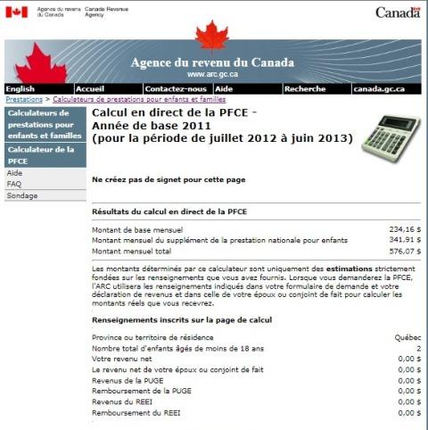 Habitués kobico Posté(e) 15 janvier 2013 Habitués Posté(e) 15 janvier 2013 Blockquote'data-author="Blueberry" data-cid="1264259170" Les allocations familiales comme on l'entend en France n'existent pas au Québec. Pour avoir droit au congé maternité au Québec, il faut avoir cotisé au régime québécois d'assurance parentale. Pour ce, il faut avoir travaillé un certains nombre d'heure et avoir gagné un certain montant. http://www.rqap.gouv.qc.ca/ Pour les prestations niveau Gouvernement du Canada, il y a 2 types, $ 100/mois/enfant jusqu'au 6eme anniversaire de l'enfant et un supplément de revenu. Pour bénéficier du supplément, il faut un avis d'imposition car c'est là-dessus que se fait le calcul. Si vous n'avez jamais travaillé et cotisé au Canada, il va etre tres difficile d'obtenir des prestations, ou elles seront minimes. Pour les allocations familiales, elles sont établies en fonction de la déclaration d'impôt de l'année d'avant ( il faudra que vous donniez vos relevés des 2 dernières années avant de venir). Elles sont versées le 20 du mois par le gouvernement par le Canada + 100$ par enfant de moins de 6 ans (ce montant là est sans condition de revenu mais imposable) et le 1er du mois le gouvernement du Québec par le biais de la Régie des Rentes du Québec (RRQ) donne un autre montant. Pour être plus précis, depuis 2005, les allocations familiales offertes par le Québec se nomment "prestations de soutien aux enfants". C'est un régime universel où le montant des prestations est dégressif à compter d'un revenu familial de 46,251$. Les explications ici:http://www.mfa.gouv.qc.ca/fr/Famille/soutien-famille/aide-financiere/soutien-financier/Pages/index.aspx Les nouveaux arrivants ont droit à ces prestations dès leur arrivée même s'ils n'ont pas produit de déclarations fiscales au Québec. Il suffit de compléter un formulaire attestant des revenus gagnés hors Canada pour les 2 années précédentes. Le formulaire ici:http://www.rrq.gouv.qc.ca/SiteCollectionDocuments/www.rrq.gouv.qc/Francais/formulaires/soutien_aux_enfants/LPF812_fr.pdf Une simulation (CalculAide de la RRQ) pour l'auteur du fil, BBL, sur la base d'un couple ayant 2 enfants et "zéro" revenu au Québec retourne un résultat de 290$/mois. Côté fédéral, c'est la même chose. Les nouveaux arrivants, en l'absence d'un avis de cotisation, doivent compléter le formulaire suivant pour établir les prestations auxquelles ils ont droit dès leur arrivée: http://www.cra-arc.gc.ca/F/pbg/tf/rc66sch/rc66sch-11f.pdf Les infos générales ici:http://www.cra-arc.gc.ca/bnfts/cctb/fq_qlfyng-fra.html ou là pour toutes les provinces canadiennes:http://www.cra-arc.gc.ca/F/pub/tg/t4114/t4114-f.html Le simulateur est sur cette page. Il faut cliquer sur le lien PFCE: http://www.cra-arc.gc.ca/bnfts/clcltr/menu-fra.html Une famille, couple avec 2 enfants, sans revenu recevra les montants maximums suivants: Citer