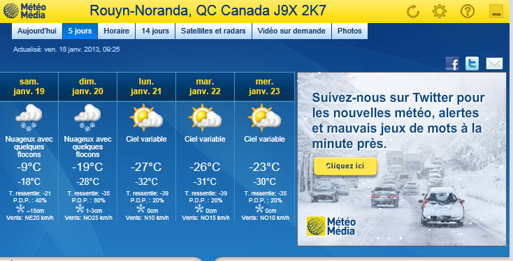 Invité Posté(e) 18 janvier 2013 Posté(e) 18 janvier 2013 Ne vous en faite pas,le printemps s'en vient au Québec... Température en Abitibi-Témiscamingue pour les 5 prochains jours! Citer