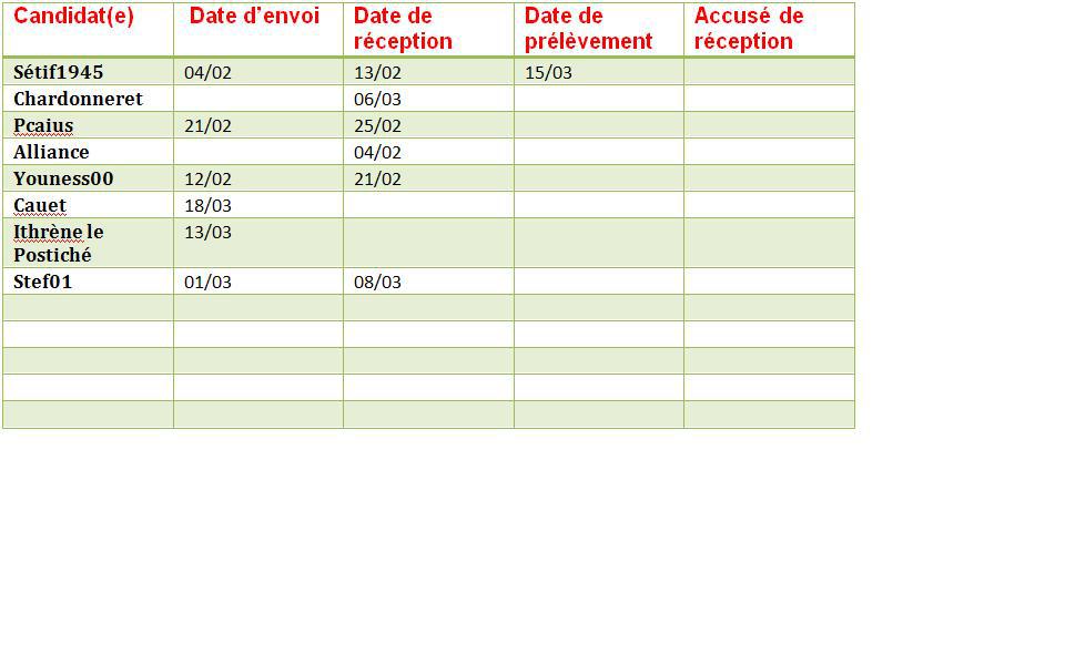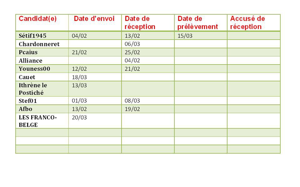 Habitués Ithrène le Postiché Posté(e) 22 mars 2013 Habitués Posté(e) 22 mars 2013 (modifié) MISE A JOUR DES STATS Pseudo Du Candidat.............Date d'envoi.............Date de Réception..............Accusé de Réception...............Date du Prélèvement..............Numéro de Dossier 1) Sétif1945.................................??????............................13/02..................................?????........................................15/03....................................????2)Amine chardonneret................??????.............................06/03.................................?????........................................?????....................................???? 3) Pcaius.....................................21/02................................25/02.................................?????........................................?????....................................???? 4) Alliance 1ere..........................??????..............................04/02.................................?????........................................?????....................................???? 5) Youness00...............................19/02...............................21/02.................................?????........................................?????....................................???? . 6) Cauet......................................18/03................................1803..................................?????........................................?????....................................???? 7) Ithrène le Postiché...................17/03...............................?????.................................?????........................................?????....................................???? Je me suis permis d'apporter ma touche, à vous maintenant d'ajouter ou d'actualiser vos stats Modifié 22 mars 2013 par Ithrène le Postiché Citer