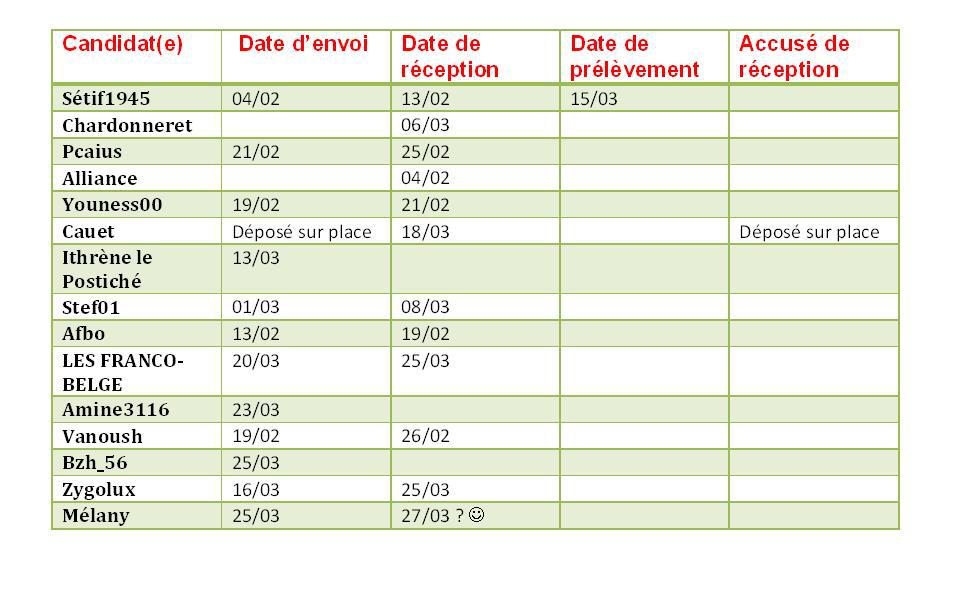 Habitués Sétif1945 Posté(e) 25 mars 2013 Habitués Posté(e) 25 mars 2013 Bonsoir la secte , Félicitation Le Franco_Belge, si ton dossier est complet bietôt le prélèvement, je vous le souhaite de mon coeur à tous :Youness, Chardonneret, mélany,Alliance, Cauet, Ithrène Amine, Vanoush, Bzh,Zygolux.. voici la dernière MAJ du tableau récap de la secte F-M: Bon courage à tous Ah non non non ! La Secte© c'est un nom déposé et je veux mes royalties non mais oh ! Sinon ben je suis de janvier à l'origine mais après un petit incident je vais sûrement avoir les délais comme vous et non ma secte© d'origine ! PS: Votre tableau il est chouette, et je dirais même classe Salut trug , j'ai cherché sur espace.net mais j'ai pas trouvé une marque déposée nommée La Secte@, demain je vais appeler INPI (Institut national de propriété industrielle ) pour le confirmer Sinon on va l'appeler La Sècte avec *è* Bienvenue chez la La Sècte F-M Bonne soirée à tous Envoyé par l'application mobile Forum IC Citer