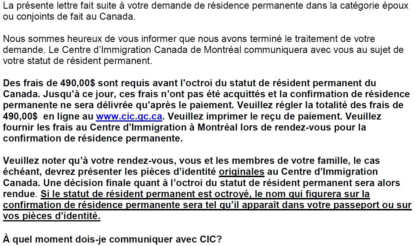 rome5 Posté(e) 28 avril 2013 Posté(e) 28 avril 2013 Bonjour/Bonsoir à tous et à toutes. Je vis au Québec avec ma femme, et je suisparrainé par elle pour l'obtention de la résidence permanente. À ce stade j,ai déjà obtenu mon CSQ, etj'attend la réponse pour la RP. il y a une semaine et plus, j'ai recu un email(voir en pj) qui disait : Nous sommes heureux de vous informer que nousavons terminé le traitement de votre demande de résidence permanente. Le centre d'immigration de Montréal communiquera avec vous au sujet de votre statut derésident permanent. De plus il nous demandait de payer 490 $ pour l'octroi dustatut de résident permanent et qu'une décision finale sera rendu lors de notrerendez-vous au bureau d'immigration canada à Montréal. Cependant, je n'ai pas encore recu le messageou la lettre de immigration canada à montréal pour le rendez vous, Mais je meposait certaines questions, et j'espère y trouver des réponses. Mes question sont les suivante: 1-Quelle est la durée que sa prend avant que le centre de immigration canada à montréal me contacte pour le dis rendez vous ? est ce 1 mois, 2 ou 3 ou bien ? 2-Quels sont les documents qui me seront demandés d'apporter ? des preuves (acte de mariage) ?? des albums photos ?? ou bien ? 3-est-ce que c'est une entrevue complète ou bien simplement un rendez-vous pour que j'ai mon visa de résident permanent ? Je veux juste me préparer en conséquence. 4-Est ce qu'il y aurait des personnes parmis vous qui aient déjà recu aussi celà ??? si oui, comment est ce que celà c'était passé ? 5-Est ce que il faut que ma femme qui me parraine soit présente le jour du rdv ? 6-Quelles sont les types de questions qui sontposés à ce rendez vous ? Merci à vous et bonne journée ou soirée Citer
