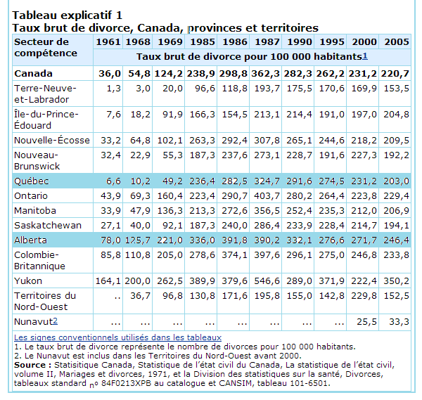 Toutefois, si "le divorce n'est pas le but ultime des jeunes filles, loin s'en faut", peux-tu m'expliquer pourquoi le taux de divorce en Alberta est plus élevé qu'au Québec pour la période allant de 1961 à 2005?