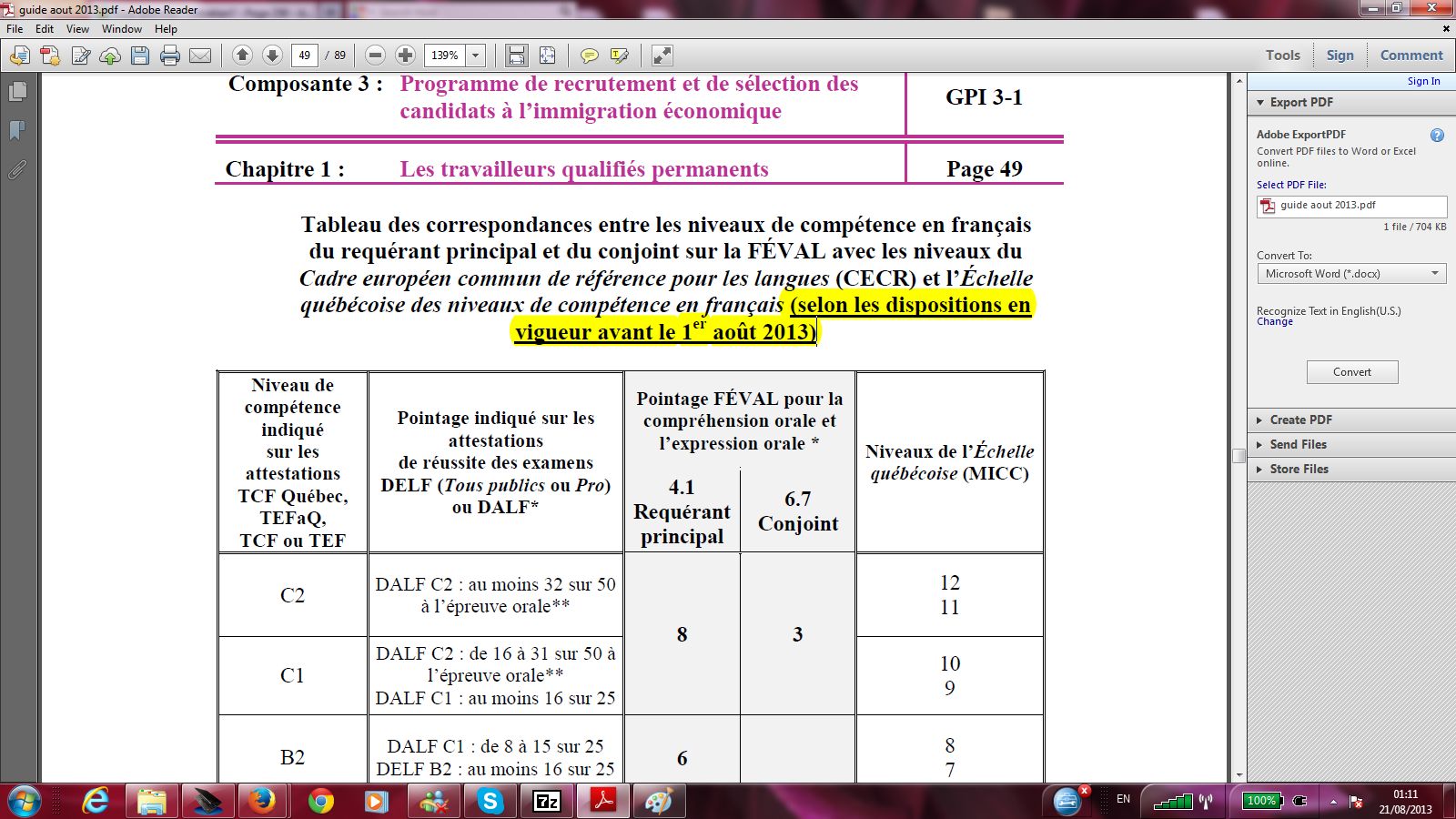 en décortiquant le nouveau guide des procédures d'immigration Guide 2013; je peux te dire et te confirmer que le MICC maintient toujours l'ancien pointage pour le niveau du français et anglais pour les dossiers en cours de traitement Chapitre 1 Page 49