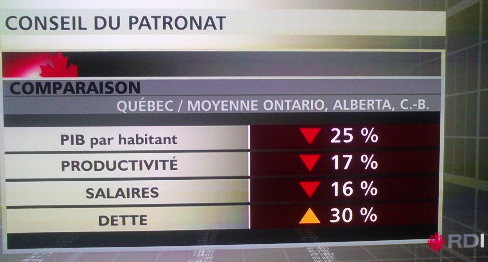 Habitués Gaetan Posté(e) 24 septembre 2013 Habitués Posté(e) 24 septembre 2013 Vu sur radio Canada ce soir : une étude faite par le conseil du patronat, qui compare le Québec avec les 3 autres provinces qui comptent : Alberta, Ontario, Colombie Britannique. le Québec est : 25% en dessous en matière de PIB par habitant 17% en dessous en matière de productivité 16% en dessous en matière de salaires et pour la dette c'est 30% au-dessus des autres. Le Québec est aujourd'hui au point mort pour la croissance économique. On attend la reprise américaine pour que ça reprenne... Amirouche de belcourt a réagi à ceci 1 Citer