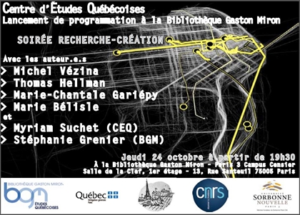 immigrer.com Posté(e) 24 octobre 2013 Posté(e) 24 octobre 2013 Lancement de la nouvelle programmation du Centre d'études québécoisesLe Centre d'études québécoises présente, le 24 octobre à la Bibliothèque Gaston Miron, ses projets pour lannée universitaire 2013-2014.Participeront à cette soirée en lectures et chansons, les auteurs Michel Vézina, Marie-Chantale Gariépy et Marie Bélisle ainsi que le chanteur-compositeur Thomas Hellman.Voici la description officielle du lancement :« De part et dautre de lAtlantique, les universités sont en effervescence. Lampleur prise par le Printemps dit "érable" au Québec montre que ce mouvement dépasse largement linstitution universitaire. Il ne sagit pas seulement dune querelle de spécialistes, dune révolte contre les frais de scolarité ou dun débat sur les conditions de fusion des établissements. Tout se passe comme si les enseignants-chercheurs et les étudiants avaient (re)pris conscience de leur position privilégiée et, par là-même, de leur responsabilité dans la recherche de véritables alternatives là où les politiques et les médias ne savent que diagnostiquer une "crise"."Je ne sais pas ce que nous allons trouver, ni quand. Ce que je sais en revanche, cest que nous ne trouverons pas seuls. Cest précisément là que le dialogue entre les sciences humaines et sociales en France et les Humanités au Québec me semble précieux et même indispensable. Je pense aussi quil ne suffira pas de tenir des discours : cest en acte que nous expérimentons ensemble de nouvelles réponses et de nouvelles questions. Voilà létat desprit dans lequel nous avons imaginé cette soirée de lancement, qui tente de performer lélaboration dune pensée critique à la jonction de la démarche universitaire et de la création artistique."Myriam Suchet, directrice du Centre d'études québécoisesUniversité Sorbonne Nouvelle Paris »source : http://www.mrifce.gouv.qc.ca/portail/_scripts/ViewEvent.asp?EventID=15202&lang=fr&strIdSite=parLe lancement aura lieu le jeudi 24 octobre 2013 à partir de 19 h 30. Citer