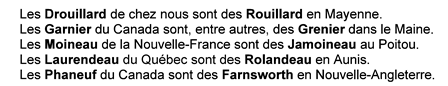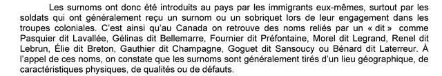 Habitués Un Canadien errant Posté(e) 14 novembre 2013 Habitués Posté(e) 14 novembre 2013 Des surnoms qui remplacent le patronyme d'origine...Une spécialité québécoise! image1.jpg image 2.jpg image3.jpg image 4.png Désolée pour la mise en page... Voici un court mais excellent article scientifique sur "Les noms de famille du Canada français: Origines et évolution", rédigé par un chercheur de Concordia, et qui explique de manière très succinte cette dynamique: http://www.univ-rouen.fr/dyalang/glottopol/telecharger/numero_9/gpl9_01picard.pdf On y aborde notamment: Les noms français qui n'ont pas été modifiés après l'arivée au Québec Les noms français modifiés (avant ou après l'immmigration) avec les changements orthographiques et les changements phonologiques Les noms étrangers modifiés (anglais, allemands, basques et bretons, etc.) Citer