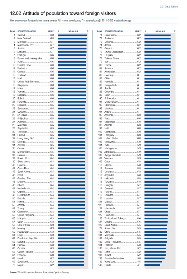 immigrer.com Posté(e) 22 novembre 2013 Posté(e) 22 novembre 2013 Infographies : quels sont les pays les plus accueillants ?DESTINATIONS | ISLANDE | ETUDE | Le 20 novembre 2013 à 16h 57Les Islandais seraient la population la plus accueillante avec les visiteurs étrangers.Daprès le World Economic Forum, lIslande, la Nouvelle Zélande et la Maroc seraient les pays les plus accueillants.Le dernier rapport du World Economic Forum (WEF) sur la compétitivité des destinations dans le tourisme, soit près de 500 pages de données et danalyses, dresse un tableau pertinent des différents facteurs positifs et négatifs pour attirer les touristes. Ce rapport présente notamment un classement de 140 destinations portant sur 80 critères.Le Wall Street Journal a réalisé une infographie en se basant sur lun de ses critères : lattitude des populations envers les visiteurs étrangers. Daprès cette carte, lIslande, la Nouvelle Zélande et le Maroc seraient les pays les plus accueillants. En revanche, la Bolivie serait le pays le moins accueillant suivi du Venezuela et de la Russie. La France est en 80ème position sur 140 pays.source : http://www.lechotouristique.com/article/infographies-quels-sont-les-pays-les-plus-accueillants,59420#xtor=EPR-2 SDCLEO a réagi à ceci 1 Citer