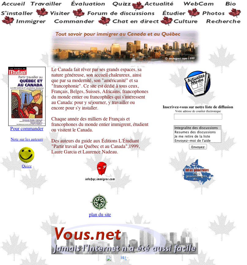 Laurent Posté(e) 25 novembre 2013 Posté(e) 25 novembre 2013 Le site IMMIGRER.COM crée en avril 1999 a maintenant passé la barre des 100,000 membres actifs, c'est à dire qui sont significativement présents sur le site avec plus de 1.1 million de messages postés sur le forum de discussions. Les 12 derniers mois le site a attiré 6.5 Millions de visiteurs dont 2.5M du Canada et 2.2M de France. 30 millions de pages y ont été consultées. Le forum a ouvert ses portes en juin 1999, et je me souviens encore des premiers messages postés. C'est normal, je recevais un courriel à chaque fois Rapidement le trafic a augmenté et en période de pointe, le serveur plantait carrément, il fallait le redémarrer manuellement... Parfois à 3 heures du matin. Entre 1999 et 2002, nous étions passés de 1 à 7 serveurs en parallèle pour accueillir le flux de visiteurs. L'engouement pour le Canada ne date donc pas d'hier. Avec les années, vous avez été de plus en plus nombreux à visiter IMMIGRER.COM. Pour vous donner une idée, fin 1999, il nous fallait une semaine pour faire le trafic d'une minute aujourd'hui. Voici à quoi il ressemblait en octobre 1999. C'était la fameuse époque du Far-Web. angela57 a réagi à ceci 1 Citer