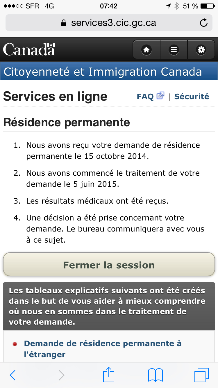 Habitués Hockeyj Posté(e) 10 juin 2015 Habitués Posté(e) 10 juin 2015 Federal: 10 octobre 2014 : dossier federal envoyé 15 octobre 2014 : dossier arrivé à Sydney 19 février 2015 : AR sydney 15 avril 2015 : AR Paris avec demande des frais de RP 16 avril 2015 : reçu instructions pour la visite médicale 21 avril 2015 : visite médicale 6 mai 2015 : l'ambassade a retrouvé le dossier envoyé par le médecin suite à un email que j'ai envoyé leur demandant pourquoi mon statut CIC n'avait pas changé 8 mai 2015 : site cic mis à jour avec "résultats medicaux reçus" 10 juin 2015 : brune reçue par courrier (statut CIC n'a pas changé, toujours sur résultats médicaux reçus) Sétif1945 a réagi à ceci 1 Citer
