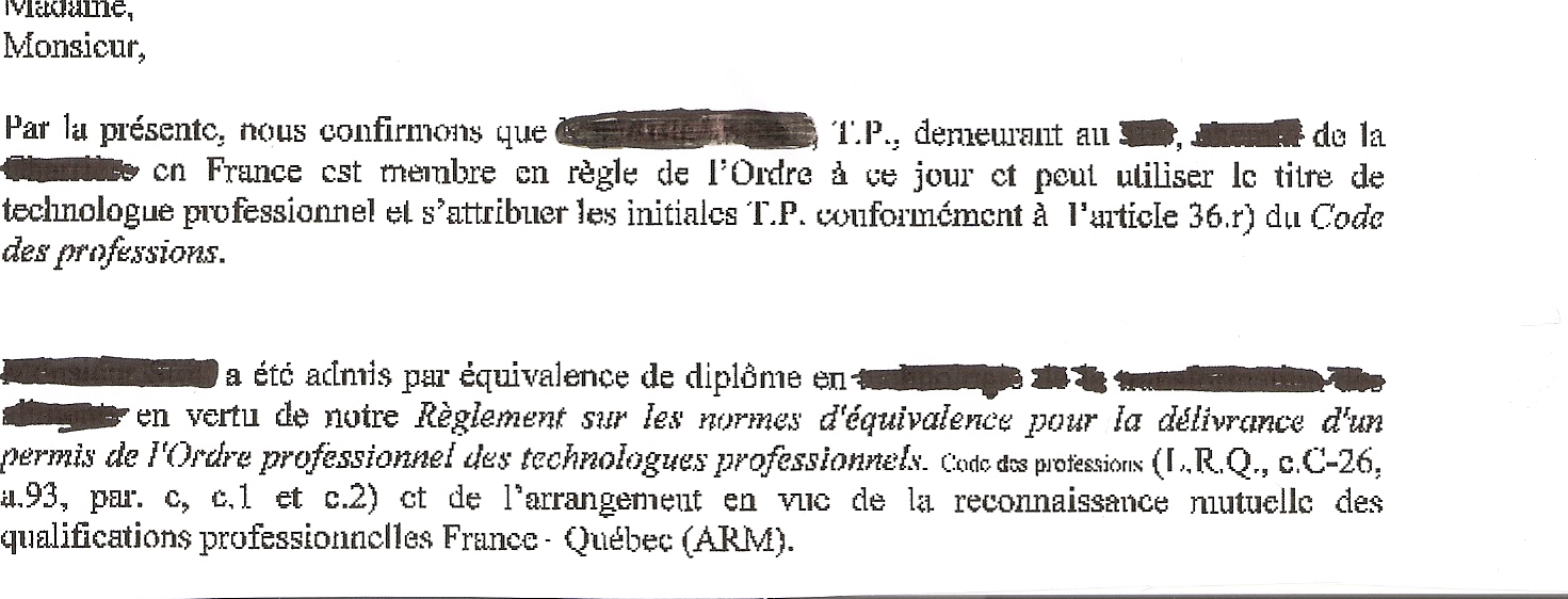 matheousse Posté(e) 24 janvier 2014 Posté(e) 24 janvier 2014 (modifié) Bonjour, Je suis entrain de préparer mon CSQ, j'arrive à la partie : Autorisation d'exercice d'une profession ou d'un métier réglementé et arrangement de reconnaissance mutuelle entre la France et le Québec 28.autorisation d'exercice delivrée par un organisme de reglementation quebecoise 29. permis d'exercice en france 30. avis d'admissibilite a l'ARM Je suis technicien dans l'agro-alimentaire et j'ai fait une demande à l'ordre des technologues professionnel du Québec, et j'ai reçu un document de leur part qui répond à la question 30, mais pas sure qu'il réponde à la question 28. à votre avis est-ce que ce document que je vous ai mis en pièce jointe répond il à la question 28 et 30 ou doit-je demander un autre document? Pour la question 29, alors la c'est comment dire difficile je ne fait pas parti d'un organisme j'ai juste un diplome dépendant du ministère de l'agriculture et de l'environnement. Doit-je me tourner vers eux ou mon diplôme suffit-il? Modifié 24 janvier 2014 par matheousse Citer