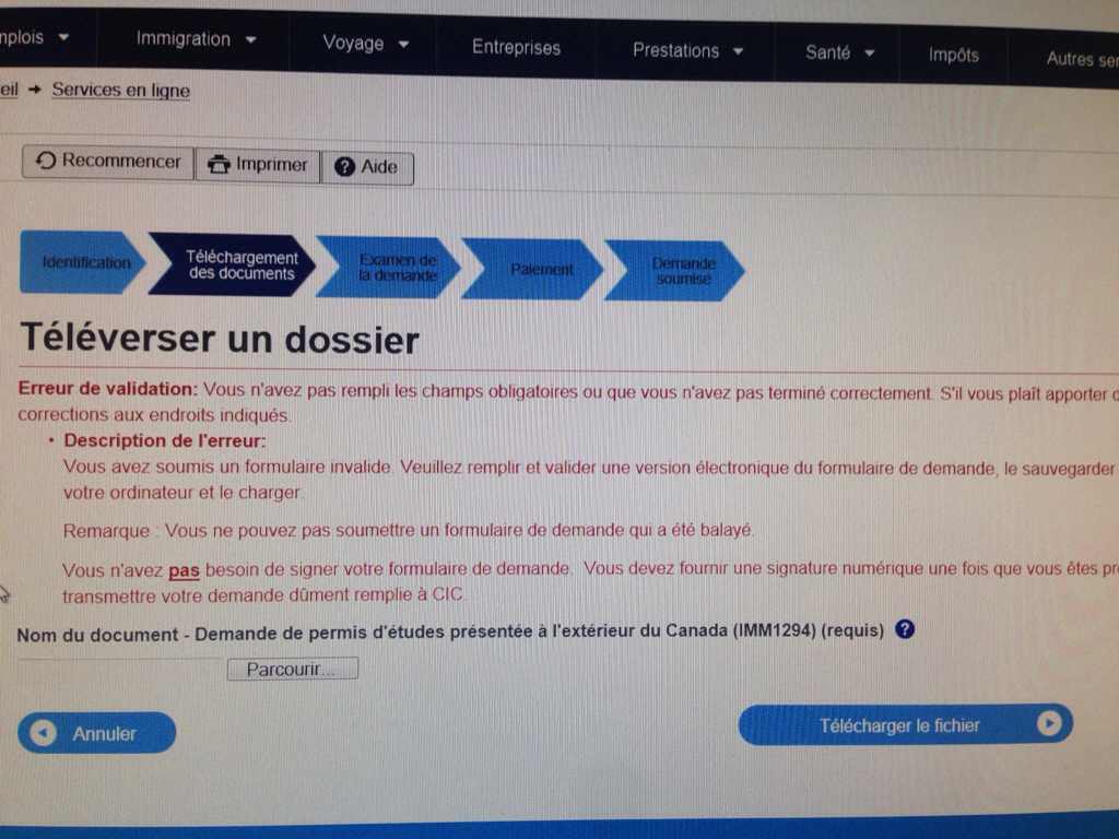 Habitués bambas Posté(e) 23 juin 2014 Habitués Posté(e) 23 juin 2014 (modifié) ImageUploadedByForum IC1403531693.968879.jpg July S. = > je lai su en moine dune Semaine je suis depuis une semaine sur la demande en linge CIC JE vire FOLLE. J'ai finalement réussi a enregistrer tous mes documents a l'exception du formulaire principal. Celui ci est complété, je n'ai aucune anomalie et j'ai cliqué sur "valide". La bécane me dit que tout est bon. Mais lorsque je veux le televerer, voici le message que le cic m indique !!! (Voir image) Quelqu'un peut m aider ? Me conseiller svp ? Je deviens dingue. Merci Envoyé par l'application mobile Forum IC le formulaire principal , c'est le IMM1294 ? si oui est ce que tu as les codes barres en dernière page? Est ce que tu as répondu à toutes les questions précédées d'une Astérix ? si il y une ou des questions sans réponse , tu ne peux pas le téléverser ! Modifié 23 juin 2014 par bambas Citer