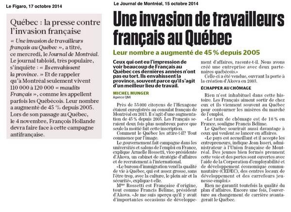 immigrer.com Posté(e) 17 octobre 2014 Posté(e) 17 octobre 2014 Québec : la presse contre l'invasion française Publié le 16/10/2014 à 21:28 «Une invasion de travailleurs français au Québec», a titré, ce mercredi, le Journal de Montréal. Le journal tabloïd, très populaire, s'inquiète: «Ils envahissent la province.» Et de rappeler qu'à Montréal seulement vivent 110.000 à 120.000 «maudits Français», comme les appellent parfois les Québécois. Leur nombre a augmenté de 45 % depuis 2005. Lors de son passage au Québec, le 4 novembre, François Hollande devra faire face à cette campagne antifrançaise. source et suite : http://www.lefigaro.fr/mon-figaro/2014/10/16/10001-20141016ARTFIG00427-quebec-la-presse-contre-l-invasion-francaise.php Citer