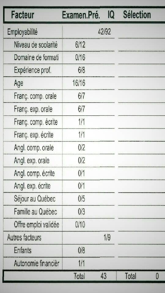 Habitués Rbreg Posté(e) 18 janvier 2015 Habitués Posté(e) 18 janvier 2015 Mes salutations à toutes et à tous, Après avoir reçu une intention de refus en décembre 2014, à cause d'un manque de points, 43 points. J'ai eu comme explication que: premièrement, 0 point pour le domaine de formation puisque celui déclaré dans la DCSQ ne correspond à aucun domaine d'étude Québécois . Deuxièmement, vous avez obtenu 6 points pour le niveau de scolarité, puisque celui-ci correspond à 2 ans d'étude Universitaire. Qu'est que j'avais fait ? J'ai vérifié ma DCSQ et j'avais constaté que j'avais mis sciences informatiques au lieu de sciences de l'informatique, comme il est mentionné dans la liste de domaine de formation, et que j'avais oublié d'envoyer l'attestation de mon diplôme de licence, celle l'état de mon pays m'avait remise. Donc, j'avais envoyé une lettre de réponse, j'ai mentionné l'erreur et je leur ai demandé de porter la correction pour moi. Sciences de l'informatique et ce que j'avais mis, U115 dans la liste de domaine de formation 2013. Vendredi dernier j'ai reçu une lettre avec les mêmes explications. Trop paradoxal et bizarre pour moi. Il y a plus d'une centaine d'anciens étudiants de la fac où j'étais qui sont au Canada par le même processus. J'ai oublié de mentionner que j'ai 6 points pour expérience professionnelle. Aidez-moi s'il vous plaît, je suis perdu. Citer