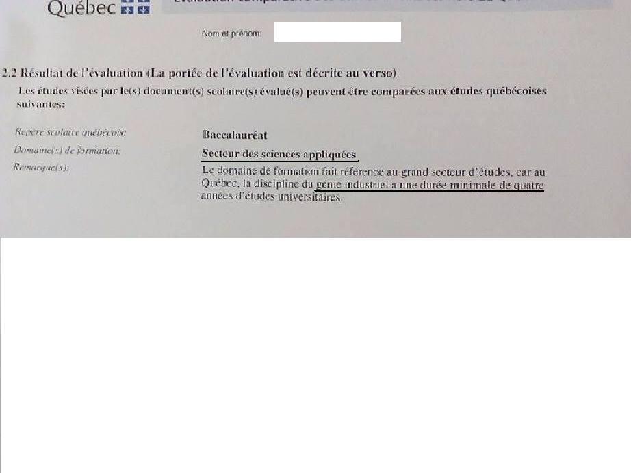Habitués hamdi2 Posté(e) 30 janvier 2015 Habitués Posté(e) 30 janvier 2015 J'ai reçu l'évaluation comparative mais j'ai pas compris de quoi il s'agit mon domaine de formation . Ils ont mentionné secteur des sciences appliquées comme domaine de formation mais il y a au dessous une remarque qui parle de génie industriel en cas ou il s'agit de 4 ans d’études universitaire. ''remarque: Le domaine de formation fait référence au grand secteur d'études , car au Quebec , la discipline du génie industriel a une durée minimale de quatre années d’études universitaires.'' Svp est ce que mon domaine de formation et le génie industriel ou non???? Voila l’étude comparative : Citer
