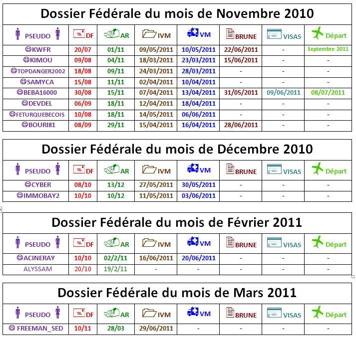 Habitués wisi2 Posté(e) 10 février 2014 Habitués Posté(e) 10 février 2014 -10/02/14 19:45- INFO: -DOLY20DZ ET NOREAK ONT PASSÉ L'EXAMEN MÉDICAL: FÉLICITATION ET BONNE CHANCE Lien pour accéder au tableau: https://docs.google.com/document/d/1TlCKlyYYX77YEfJfwBf4EUFOkVxGdeMiYYU1JjElVkI/edit |-----------------------------------VISA RP--------------------------------------| |-----Pseudo----|---DF---|--ARFS--|--ARFP--|--IEM---|--EM----|e-Brune-|---VISA---| |---------------|--------|--------|--------|--------|--------|--------|----------| |1.alg-can------|20/03/13|14/05/13|08/06/13|13/06/13|20/06/13|12/11/13|17/12/2013| |2.didou69------|20/02/13|08/03/13|25/04/13|28/05/13|30/05/13|23/12/13|19/01/2014| |3.paleo--------|17/12/12|02/02/13|--------|14/03/13|24/03/13|07/01/14|19/01/2014| |4.massimo_778--|25/03/13|10/05/13|30/05/13|05/06/13|11/06/13|07/01/14|16/01/2014| |5.softman------|14/03/13|01/05/13|22/05/13|23/05/13|25/05/13|24/01/14|01/02/2014| |6.sniperf------|--------|21/02/13|--------|20/03/13|22/05/13|21/01/14|02/02/2014| |---------------|--------|--------|--------|--------|--------|--------| |1.beginelli----|15/04/13|--------|12/07/13|24/07/13|30/07/13|04/12/13| |2.darine16-----|07/03/12|02/05/13|22/05/13|04/06/13|11/06/13|08/01/14| |---------------------------------------------------------------------| |-----------------------------EXAMEN MÉDICAL--------------------------------------| |----------------|--------|--------|--------|--------|--------|----------|--------| |Pseud-----------|---DF---|--ARFS--|--ARFP--|--IEM---|----EM--|-Reçu EM--|DebutTRT| |----------------|--------|--------|--------|--------|--------|----------|--------| |01.maminou------|14/11/12|03/01/13|00/00/13|22/02/13|28/02/13|---recu---|--------| |02.onin---------|06/03/13|30/04/13|22/05/13|23/05/13|25/05/13|-07/06/13-|23/05/13| |03.sofiane------|18/03/13|--------|--------|11/06/13|02/07/13|----------|--------| |04.boymen-------|09/04/13|05/06/13|26/06/13|04/07/13|09/07/13|-18/08/13-|04/07/13| |05.binoumino----|12/04/13|10/06/13|04/07/13|25/07/13|05/08/13|-26/08/13-|26/09/13| |06.amazigh001---|15/04/13|15/06/13|17/07/13|17/07/13|22/07/13|----------|17/07/13| |07.brafid-------|22/04/13|26/06/13|27/07/13|09/08/13|15/08/13|----------|30/09/13| |08.aze02--------|28/04/13|03/07/13|07/07/13|28/08/13|31/08/13|-15/11/13-|--------| |09.billo--------|02/05/13|30/06/13|02/08/13|13/09/13|18/09/13|-en cours-|--------| |10.imsinfo------|05/05/13|10/07/13|31/07/13|19/09/13|23/09/13|-09/10/13-|30/10/13| |11.amillo-------|15/05/13|25/07/13|14/08/13|27/09/13|01/10/13|-10/12/13-|19/11/13| |12.amiraa-------|05/06/13|19/08/13|14/09/13|09/10/13|14/10/13|-27/10/13-|19/11/13| |13.funimat------|14/05/13|30/07/13|24/08/13|05/10/13|14/10/13|-28/10/13-|18/11/13| |14.hamsad-------|16/05/13|30/07/13|24/08/13|02/10/13|10/10/13|-22/10/13-|15/11/13| |15.erable2014---|07/06/13|15/08/13|07/09/13|10/10/13|12/10/13|----------|22/11/13| |16.fehd2000-----|10/06/13|20/08/13|14/09/13|18/10/13|28/10/13|-11/11/13-|22/11/13| |17.Nac_2008-----|13/06/13|23/08/13|14/09/13|25/10/13|29/10/13|-15/11/13-|16/01/14| |18.adel_83------|22/06/13|29/08/13|26/09/13|24/10/13|31/10/13|-02/11/13-|17/01/14| |19.Viamario-----|08/07/13|01/10/13|--------|27/10/13|13/11/13|-29/11/13-|16/01/14| |20.mobinett-----|22/08/13|08/10/13|06/11/13|11/12/13|16/12/13|-28/12/13-|--------| |21.salimayachi--|09/09/13|18/10/13|22/11/13|26/12/13|07/01/14|-16/01/14-|--------| |22.naddou-------|08/11/13|03/12/13|01/01/14|08/01/14|15/01/14|----------|--------| |23.ferry--------|09/10/13|19/11/13|13/12/13|06/01/14|15/01/14|----------|--------| |24.bilibty------|11/10/13|22/11/13|24/12/13|09/01/14|12/01/14|----------|--------| |25.brahimdufort-|09/04/13|05/11/13|06/12/13|10/01/14|16/01/14|-03/02/14-|--------| |26.doudache-----|23/10/13|09/12/13|05/01/13|16/01/14|23/01/14|----------|--------| |27.sofiane02----|26/10/13|12/12/13|03/01/14|07/01/14|--------|----------|--------| |28.sidou80------|28/10/13|09/12/13|31/12/13|17/01/14|30/01/14|----------|--------| |29.addi68-------|07/11/13|19/12/13|17/01/14|21/01/14|01/02/14|----------|--------| |30.zerguimoh----|17/10/13|02/12/13|01/01/14|21/01/14|23/01/14|----------|--------| |31.inesmeradboui|02/07/13|13/12/13|17/01/14|22/01/14|26/01/14|----------|--------| |32.doly20dz-----|18/10/13|02/12/13|01/01/14|31/01/14|08/02/14|----------|--------| |33.zinai2-------|17/10/13|17/12/13|18/01/14|01/02/14|03/02/14|----------|--------| |34.dougdoug-----|08/11/13|19/12/13|17/01/14|28/01/14|07/02/14|----------|--------| |35.noureak------|30/05/13|12/08/13|22/01/14|05/02/14|10/02/14|----------|--------| |36.goodspeed2012|17/10/13|03/12/13|01/01/14|07/02/14|--------|----------|--------| |---------------------------------------------------------------------------------| |************ACCUSE DE RECEPTION FEDERAL************| |------------------|----------|----------|----------| |Pseudo------------|-dépôt FD-|-AR SYDNEY|-AR PARIS-| |------------------|----------|----------|----------| |01-samir75--------|-28/06/13-|-03/09/13-|-22/01/14-| |02-tariksam-------|-15/10/13-|-25/11/13-|----------| |03-ikos-----------|-31/10/13-|-12/12/13-|-03/01/14-| |04-abdoufares-----|-14/11/13-|-02/01/14-|-24/01/14-| |05-wikimine-------|-15/11/13-|-02/01/14-|-24/01/14-| |06-wisi-----------|-21/11/13-|-16/01/14-|-07/02/14-| |07-caviar13-------|-02/12/13-|-21/01/14-|----------| |08-amassudi-------|-07/12/13-|----------|-05/02/14-| |09-aghrib---------|----------|-26/01/14-|----------| |10-canadienne13---|-16/12/13-|-02/02/14-|----------| |------------------|----------|----------|----------| |*******DEPOT FEDERAL********| |------------------|---------| |Pseudo------------|D-FEDERAL| |------------------|---------| |01.rena_meriem----|-03/01/14| |02.futurequebecois|-08/01/14| |03.SLMH-----------|-23/12/14| |----------------------------| DOUDACHE a réagi à ceci 1 Citer