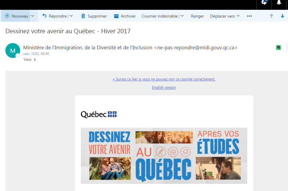 Habitués khaleader86 Posté(e) 13 février 2017 Habitués Posté(e) 13 février 2017 (modifié) Bonjour les amis j'ai reçu ce mail Vendredi soir , le Midi m'a envoyé ce mail,et c'est la première qu'on m'envoie de mail ,j'étais très contrent de recevoir un mail de la part de Midi,je croyais une bonne nouvelle,c'étais finalement un guide pour les démarches de l’expérience Québécoise (PEQ) Modifié 13 février 2017 par khaleader86 MedAmineBH, TED/A, Akiminori et 1 autre ont réagi à ceci 4 Citer