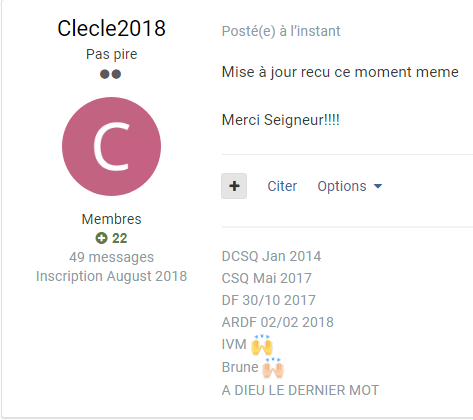 Habitués Moksha Posté(e) 11 décembre 2018 Habitués Posté(e) 11 décembre 2018 il y a 39 minutes, Geris a dit : Je rends grâce à Dieu. Ivm reçu ce 10-12- 2018 . Mes stats: Df: 03/11/2017 ARDF: 01/02/2018 Ivm: 10/12/2018 Gloire à Dieu Envoyé de mon TECNO-W5 en utilisant application mobile Immigrer.com Bravo Geris! Super, mais dis moi avant de recevoir ton 'IVM de ce jour, tu n'avais pas reçu de MAJ? Citer