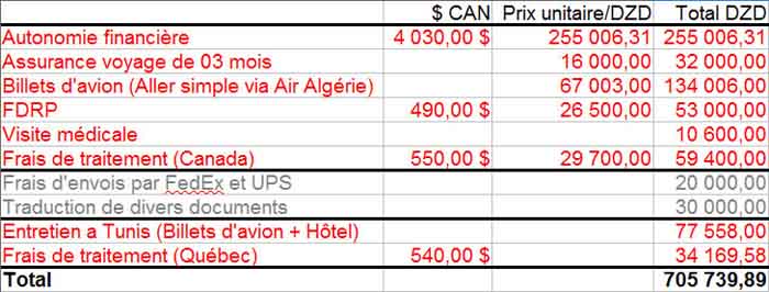 Habitués smdich Posté(e) 21 mai 2009 Habitués Posté(e) 21 mai 2009 Bonjour a tous, je crée ce poste pour aidé les futurs immigrent a ce donné une idée du budget globale a prévoir pour une immigration. J'ai bien sur pris ma propre expérience pour réaliser ce tableau, qui ne reste somme toute qu'une expérience parmi d'autre. Ce poste n'a pas était crée pour décourager quiconque mais plutôt parce qu'une bonne immigration commence par une bonne planification des le départ, pour ne pas être pris a dépourvue en bout de course, car le processus d'immigration est une course de font et pas un sprint pour nous les Algérien)Bien sur, ce budget est un minimum (ex: la somme demandé pour l'autonomie financière peut être plus élever), les sommes le taux de change pouvant fluctuer, j'ai utiliser ici le taux officielle du 21/05/09 $ CANPrix unitaire/DZDTotal DZDAutonomie financière4 030,00 $255 006,31255 006,31Assurance voyage de 03 mois16 000,0032 000,00Billets d'avion (Aller simple via Air Algérie)67 003,00134 006,00FDRP490,00 $26 500,0053 000,00Visite médicale10 600,00Frais de traitement (Canada)550,00 $29 700,0059 400,00Frais d'envois par FedEx et UPS20 000,00Traduction de divers documents30 000,00Entretien a Tunis (Billets d'avion + Hôtel)77 558,00Frais de traitement (Québec)540,00 $34 169,58Total705 739,89Je tiens à te remercier pour ton idée mais j'aimerai bien te demander de mettre en plus clair le tableau car j'ai pas réussi et à suivre ce qu'il y a écris dessus.Merci Ciao Citer
