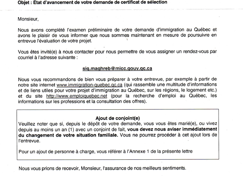 Habitués nac_2008 Posté(e) 5 septembre 2012 Habitués Posté(e) 5 septembre 2012 Bonjour mes amis forumiste ,voila je souhaiterais partager avec vous la bonne nouvelle car ce matin j'ai recu le courrier et la premiere chose que j'ai faite c'est de vous contacter ,waw je pense que je reve mais c'est la réalité,inchalah ça viendra pour ce qui reste , voila je n'est pas réussi a vous copier le message mais vous le trouverez en piece jointe biensure , j'uste une question merci de m'expliquer ce qui me reste a faire a part leur envoyer un mail pour la confirmation du rendezvous ! il on préciser dans le mail que si ya un conjoint en plus il faut retarder l'entrevue ,moi j'ai envoyer le dossier de ma femme en mars jai meme un accusé de réception donc ce n'est pas la peine que je refasse cela ! mille merci pour votre aide mes amis . au plaisir de vous lire inchalah ,soyez nombreux . FELICITATIONS CAPTIVO POUR TA DI. BONNE CHANCE POUR TON RDV. C' EST FORMIDABLE . Le SIQ reprend l'envoi des DI malgré la cession des entretiens, c'est super, cela veut dire qu'il y a une autre équipe qui continue à travail au Quebec, en plus de celle qui se trouve en Tunisie pour les entrevues. J'espère vraiment que c'est le cas, n'est ce pas dalinda, alors soyons optimistes les amis, et on verra bien si un autre ami recevra une DI prochainement pour plus de confirmation. Nac
