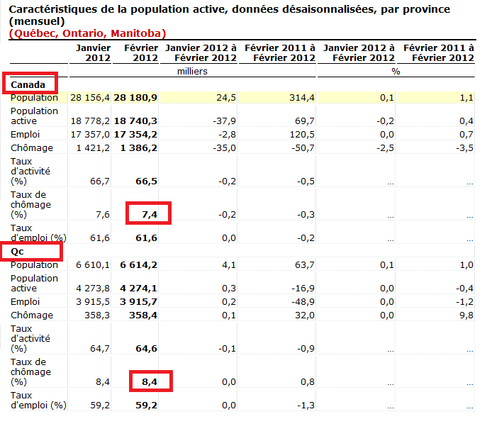Invité Posté(e) 9 mars 2012 Posté(e) 9 mars 2012 (modifié) Dernier communiqué de L'emploi.. Au canada, l'emploi était inchangé en février. À la suite d'une baisse du nombre de personnes à la recherche de travail, le taux de chômage a diminué de 0,2 point de pourcentage pour se fixer à 7,4 %. Au Québec, l'emploi était inchangé en février, tout comme le taux de chômage, qui s'est maintenu à 8,4 %. Modifié 9 mars 2012 par Alg-Can